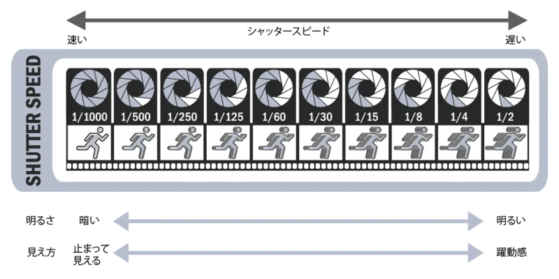 シャッタースピードは、文字通りシャッターを切るスピードのことを指しており、スピードを変えて何をしているかというと2つあります。一つは写真に躍動感を与えること、もう一つは光の取り込む時間を調整していることです。
